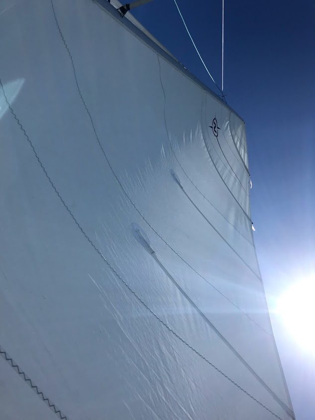 We sailed in 8-12 knots, so the boat was pretty lively, especially in the puffs. Here are a few photos of the mainsail while sailing upwind. My only complaint is my full length battens are a bit loose. As you can see from the fuzzy fleece, it was a little on the cool side. The downwind was pretty sweet.